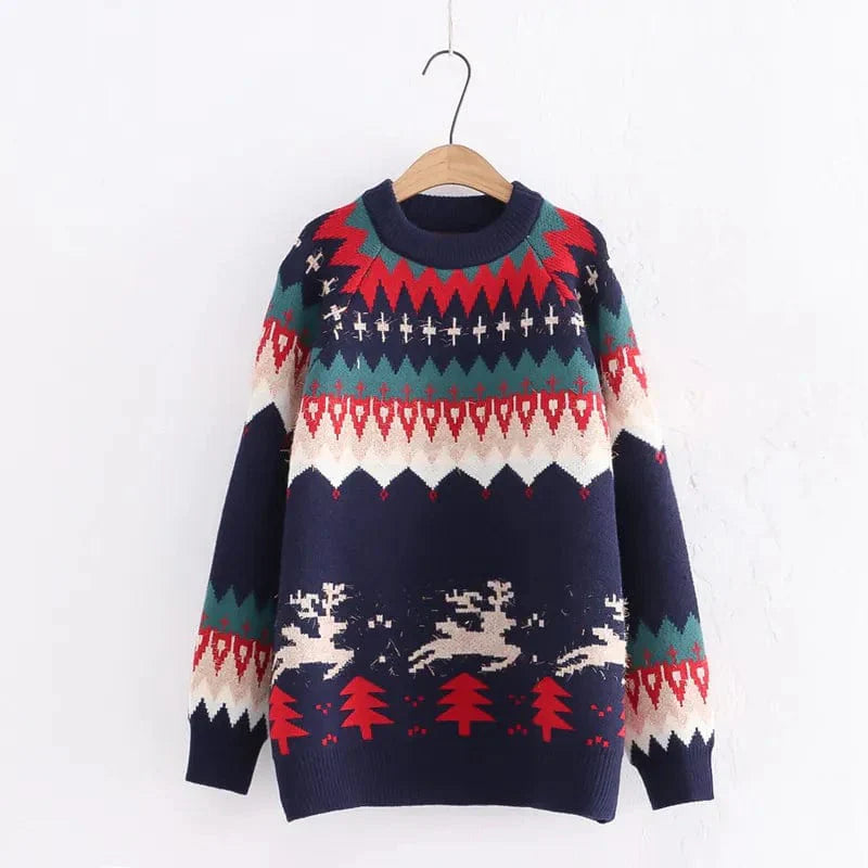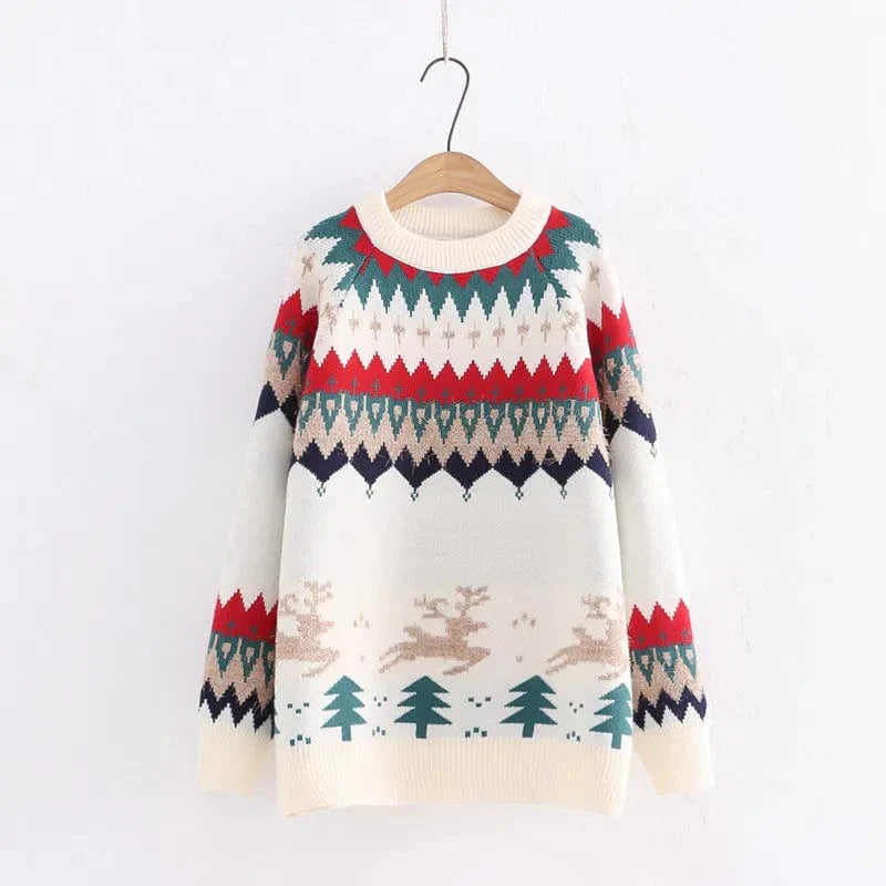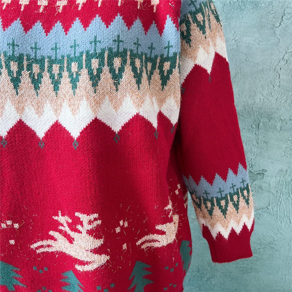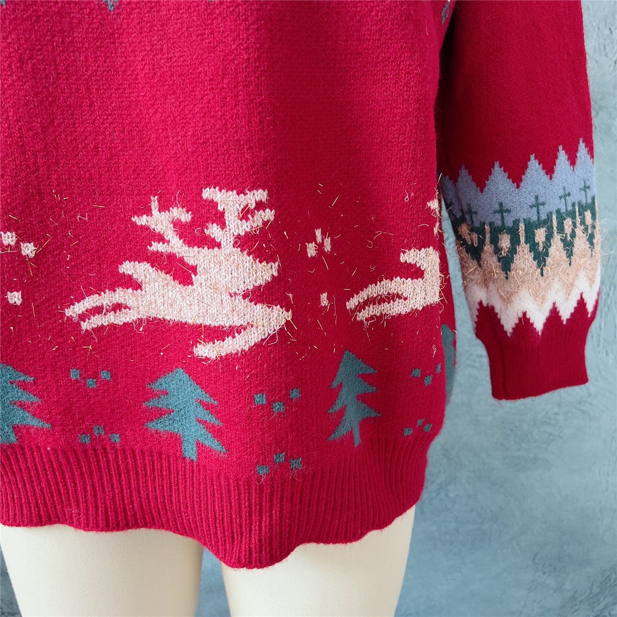 This Holly Christmas Sweater is the perfect way to show off your festive spirit in style. The jersey fabric is lightweight and soft. and the crew neck and long raglan sleeves make it cozy and comfortable. Adorned with a colorful elk Christmas tree pattern in gold thread. this pullover sweater is sure to be a hit this holiday season!